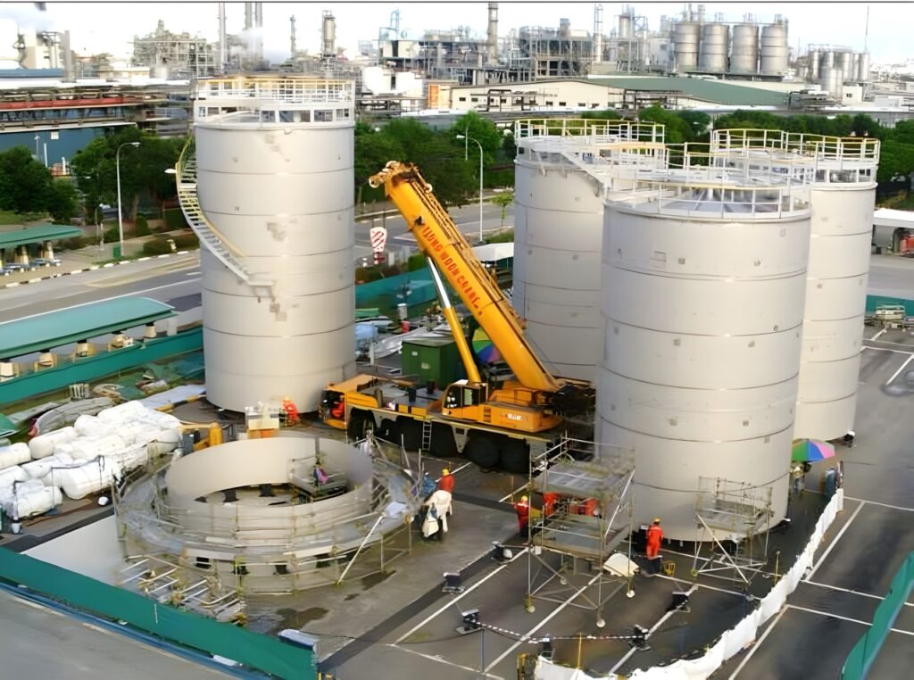 CITAL was awarded the full-scope execution of a large-scale storage tank farm for a carboxylate production unit in Singapore. The turnkey package included engineering, procurement, fabrication, erection, and commissioning of 11 stainless steel storage tanks, along with supporting structures and utilities.
